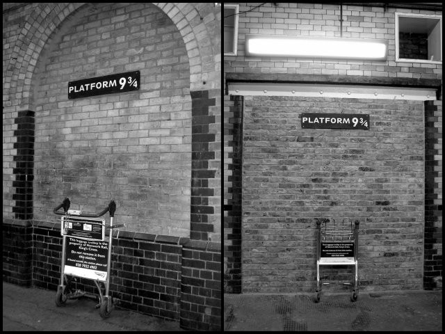 Edit juillet 2011: La platforme 9 3/4 se trouve maintenant sur le devant de king's cross au niveau de Euston road