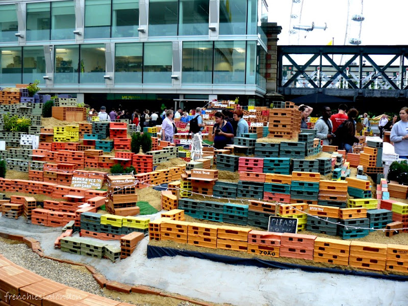 L'été, la terrasse du royal hall festival vaut toujours le détour, que ce soit pour prendre un verre quand le temps est clément (la vue sur la tamise est très chouette), que ce soit pour se rafraîchir a l'appearing room ou pour découvrir la dernière installation. Ces dernières années, il y a eu le taxi fou, les enceintes colorées. Cette année, il s'agit du projet Morrinho, un gigantesque modèle réduit des favela de rio de janero dans lequel ce sont glissés des élèments du paysage londonien ainsi que des petits messages.